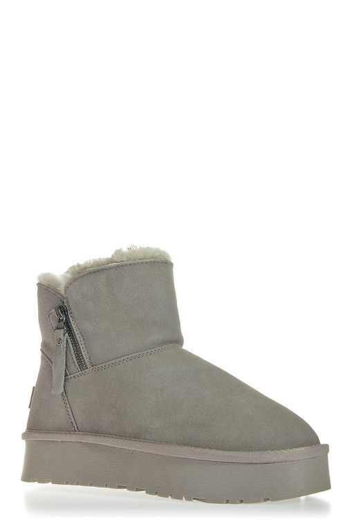 Унты выполнены из натуральной замши, верх оформлен объемными швами. Задник укреплен вставкой и дополнен логотипом бренда. Внутренняя отделка из натуральной шерсти.