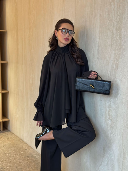 Элегантная блуза с асимметричным низом выполнена из приятного на ощупь креп-шифона. Эту модель легко вписать и в повседневный образы, дополняя брюками, джинсами, юбками или лосинами.­