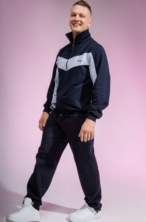 Состав: Футер 2-х ниточный, 75% хлопок, 20%  полиэстер, 5%  лайкра. Куртка: Контрастные вставки по переду и рукавам, карманы с застёжкой на молнию, эластичный пояс и манжет. Брюки: Два кармана с застёжкой на тесьму-молнию, отделка по боковому шву, по низу брюк кулисы. Таблица размеров и ростов Размер 48 50 52 54 56 58 60 62 64 Обхват груди, см 92-96 98-102 104-108 110-114 116-122 128-132 134-138 140-144 146-150 Обхват бёдер, см 99-102 103-106 107-110 109-113 114-117 118-122 124-128 130-134 136-140 Рост, см 170-176 176-182 176-182 182-188 182-188 182-188 182-188 182-188 182-188