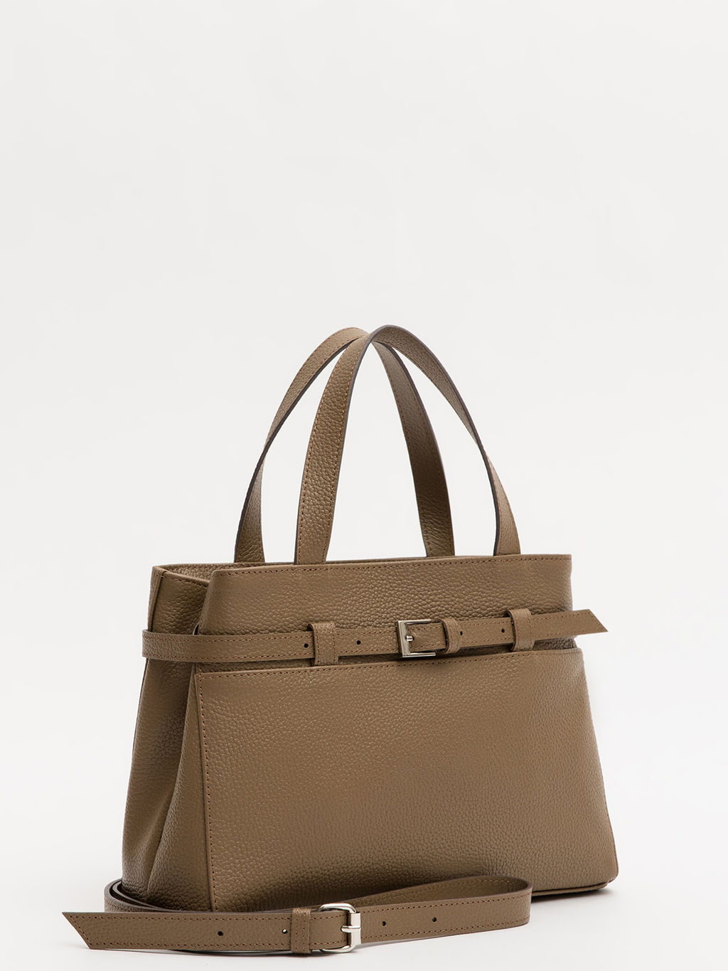 Элегантный тоут размера М, выполненный из натуральной кожи, с трапециевидным силуэтом и декоративным ремешком, опоясывающим корпус. Основное отделение с перегородкой на молнии и двумя стандартными карманами обеспечивает удобную организацию пространства. Укороченные ручки и длинный регулируемый ремень на карабинах предлагают несколько вариантов ношения. Задний карман на молнии с тиснением добавляет практичности и стиля. Идеальный выбор для тех, кто ценит лаконичный дизайн с продуманными деталями.­