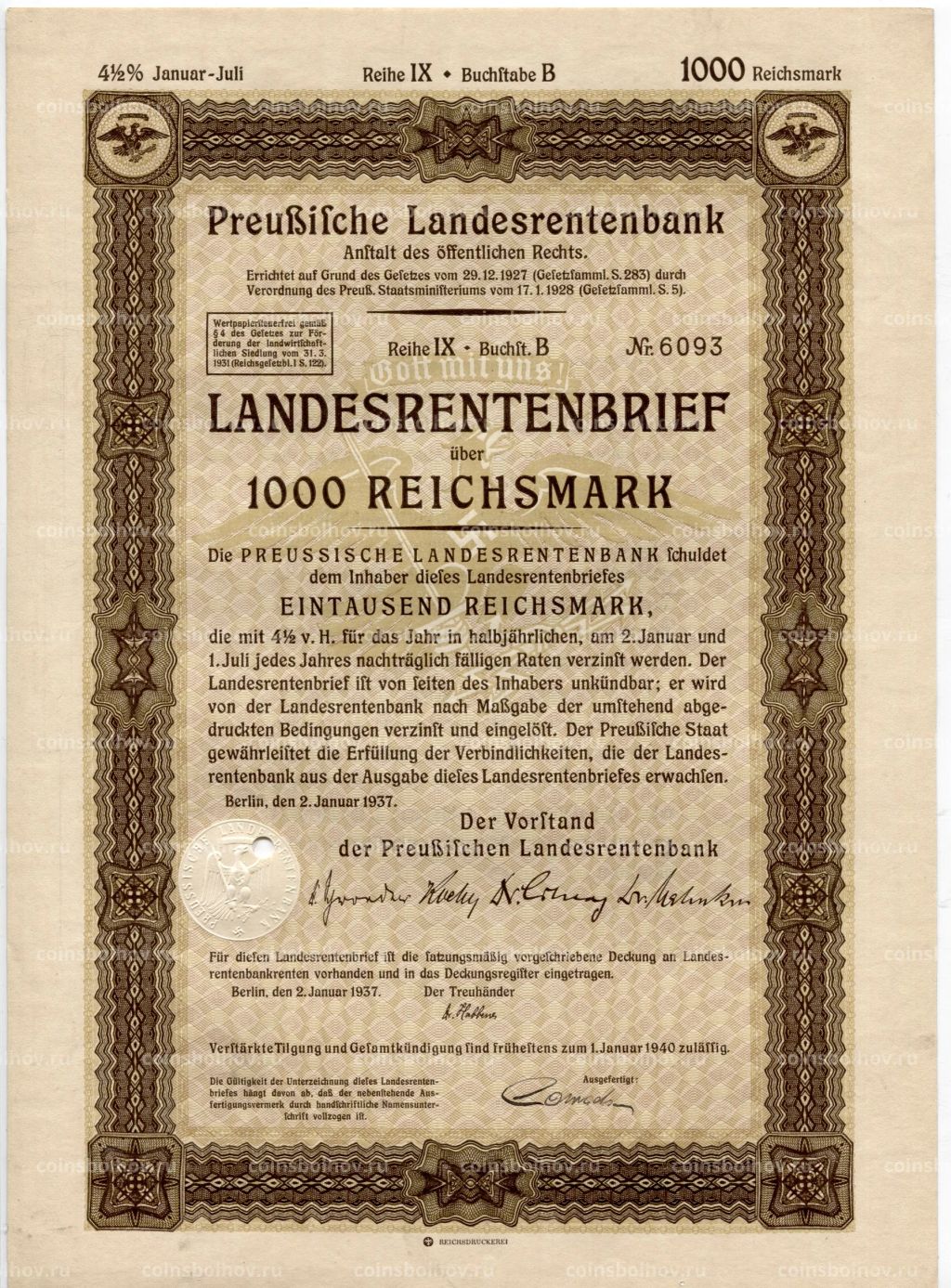 Облигация 4,5% 1000 рейхсмарок 1937 года Германия