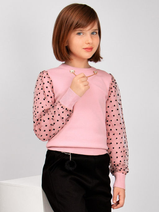 Тёплый джемпер для девочки, декорированный перламутровыми бусинами. Рукава украшены воздушным фатином. Модель дополнена съёмной брошью. Мягкий, вязаный трикотаж не сковывает движений, обладает хорошей воздухопроницаемостью и приятно облегает тело. Джемпер прекрасно сочетается как с юбками, так и с брюками.
