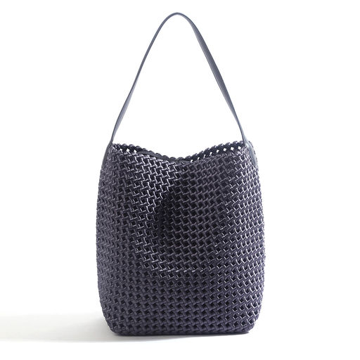 Вместительная плетеная сумка-ведро  MIRONPAN  выполнена из высокотехнологичного нейлона. Несмотря на воздушный вид сумка держит форму.  Внутри есть косметичка на молнии для хранения мелочей.