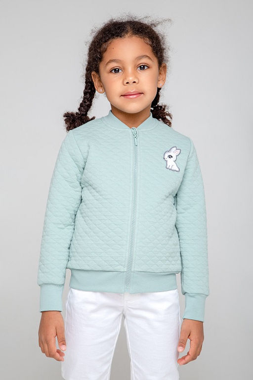 Куртка-бомбер на молнии для девочки из капитония, произведённого из натурального хлопка. У изделия эластичные манжеты и пояс, в боковых швах карманы. Куртка сохраняет цвет и форму после многократных стирок. Капитоний - это стёганное трикотажное полотно с утеплителем из полиэстеровой нити.­