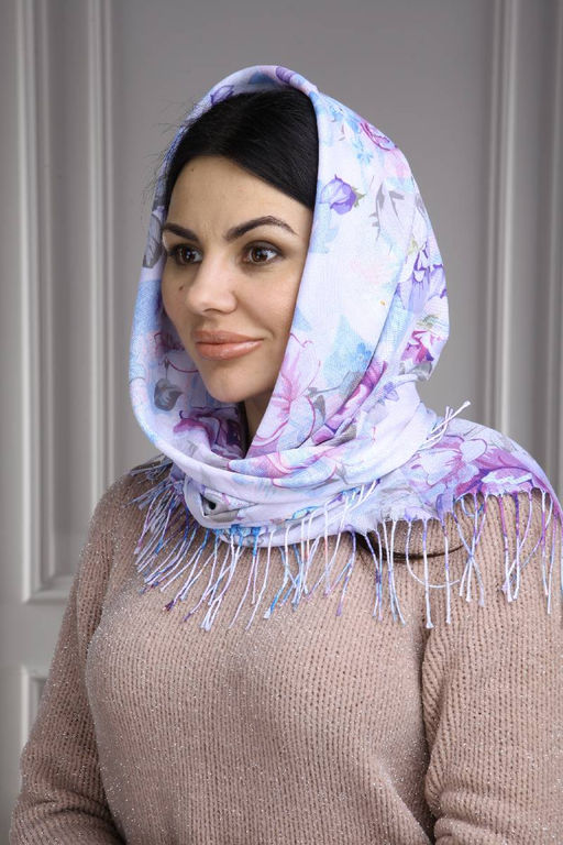 • Платок на голову, с цветами и кистями MAGROM, сиреневый, 105 х 105 см, из 100% пашмины