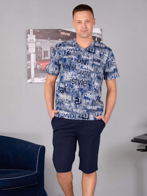 Удобный мужской костюм с шортами из натуральной хлопковой ткани. Приятен к телу и не стесняет движений. Футболка прямого кроя с V-образным вырезом. Шорты средней длинны с боковыми карманами. Пояс изготовлен на поясной машине. Ткань - кулирка, трикотажное полотно изготовленное из чистого хлопка.