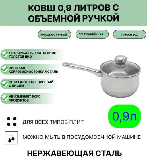 Кастрюля сферическая, вместимостью 0,9 л. Теплораспределительное дно. Нержавеющая фурнитура. Марка стали АISI 304. ГОСТ 27002­