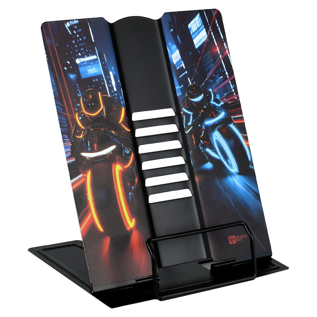 Подставка для книг и учебников Феникс+, арт.73011/ 20 НОЧНЫЕ МОТОЦИКЛИСТЫ (21х26х16.5 см, окрашенный чёрный металл, количество углов наклона: шесть, прижим для фиксации страниц: есть, ПЭТ-пакет).