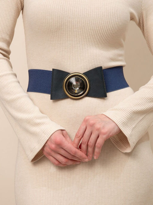 Женский ремень-резинка сине-голубого цвета шириной 6см и длиной 80см с пряжкой - бантом из искусственной кожи, декорированной ограненным стеклом в бронзовой оправе. Рекомендуем им дополнять объемные трикотажные изделия и пуховики.