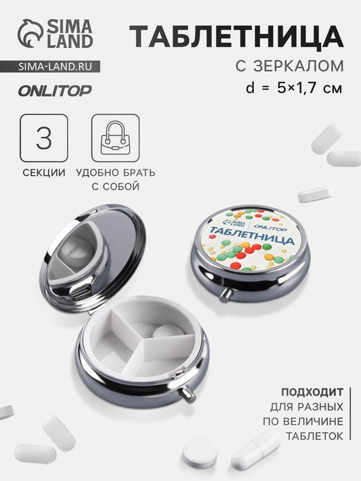 ОБРАТИТЕ ВНИМАНИЕ! Наклейка «ONLITOP» приклеена на сам товар.Компактный металлический контейнер с тремя отделениями предназначен для удобного хранения и транспортировки таблеток. Его круглая форма и серебристое покрытие подчёркивают лаконичность и практичность аксессуара.ОсобенностиТри секции обеспечивают разделение разных видов лекарств или витаминов.Металлический корпус гарантирует надёжность и долговечность.Карманный размер позволяет носить контейнер всегда под рукой.Круглая форма облегчает открытие и закрытие.Серебристый цвет придаёт аксессуару сдержанный и универсальный вид.Удобство в повседневной заботеХранение медикаментов в таком контейнере помогает поддерживать режим приёма и упрощает организацию личного аптечного набора. Лёгкий и компактный дизайн делает аксессуар незаменимым спутником в поездках и ежедневных делах. Набор: Нет. Форма: Круглая. Количество секций: 3. Рисунок: Нет. Особенности: Карманная. Бесплатная доставка: Да. Размеры товара: 5/1.7/5.