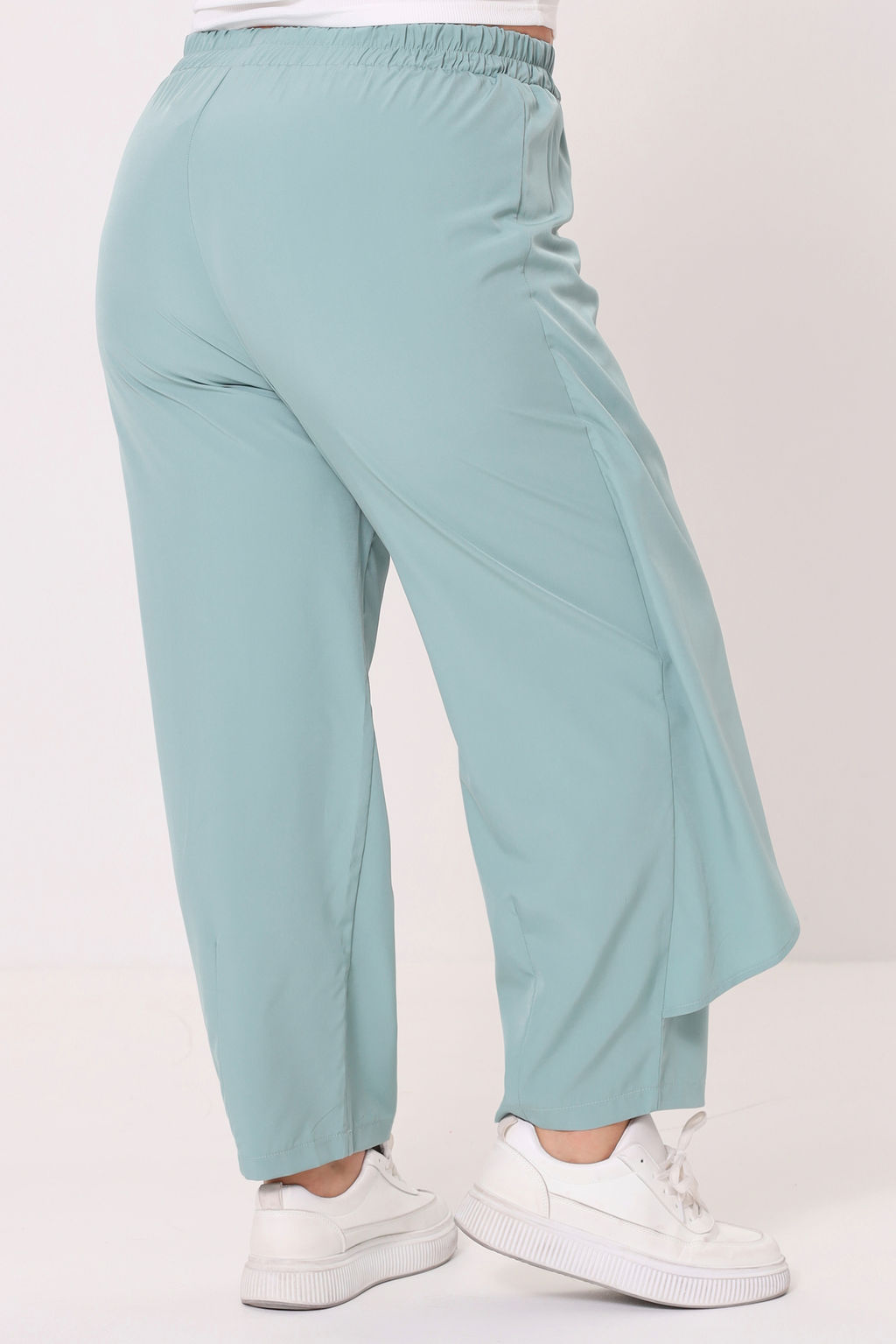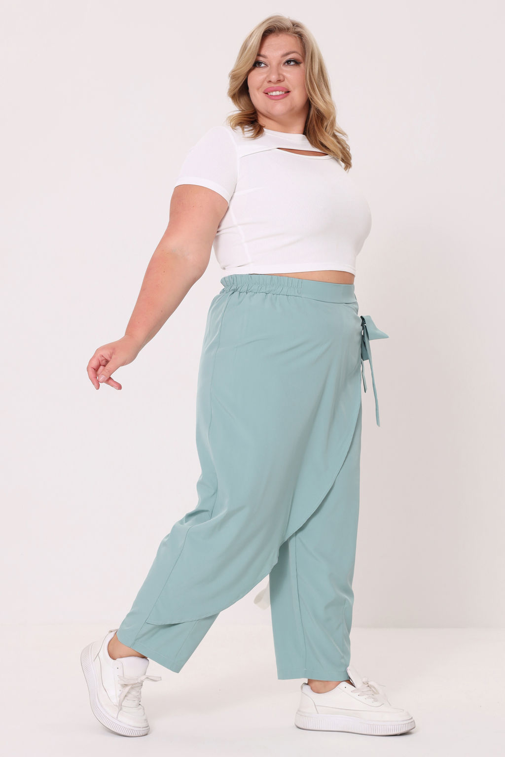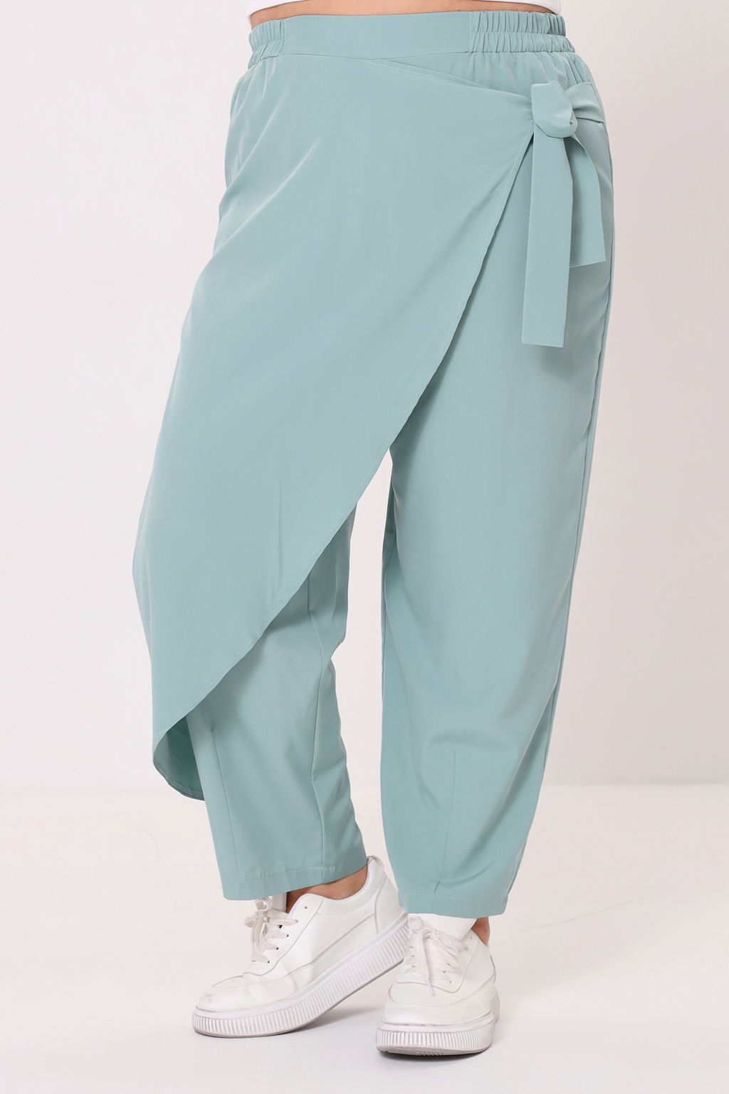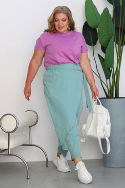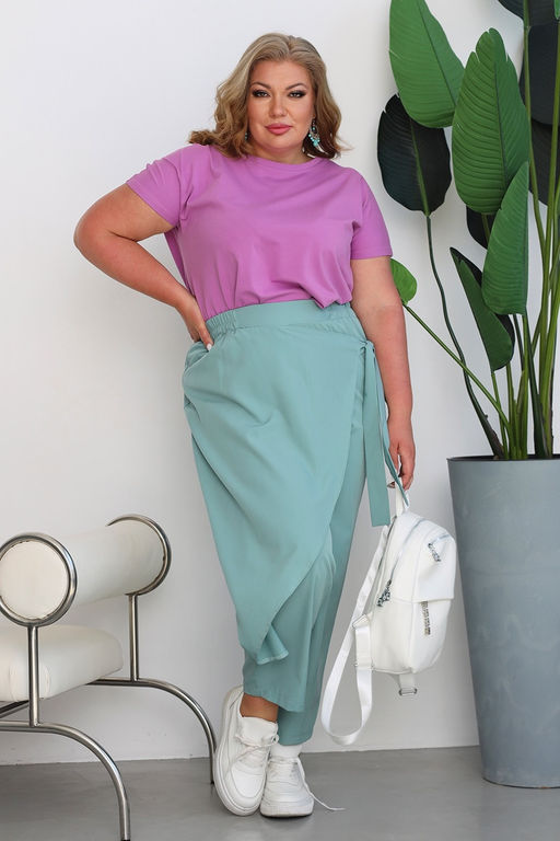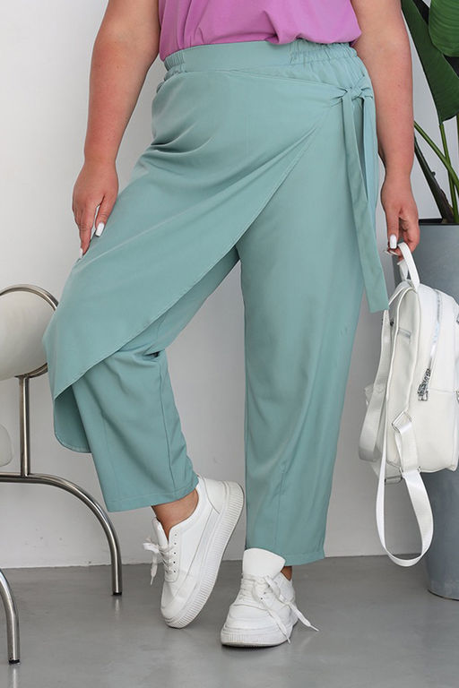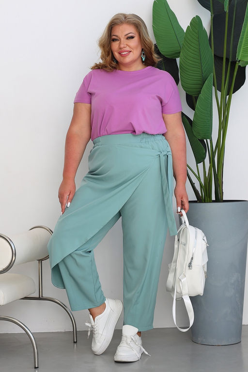 Лаконичные брюки из мягкого эластичного материала. Высокая посадка и комфортная резинка на поясе обеспечивают оптимальную посадку по фигуре. Оригинальный асимметричный  запАх спереди собирается сбоку с помощью завязки. Брюки подчеркивают женственные формы и скрывают недостатки фигуры. Модель прекрасно подойдёт для комбинирования с  блузками, рубашками, топами и жакетами. Эти модные брюки станут идеальным вариантом для создания стильного образа.
