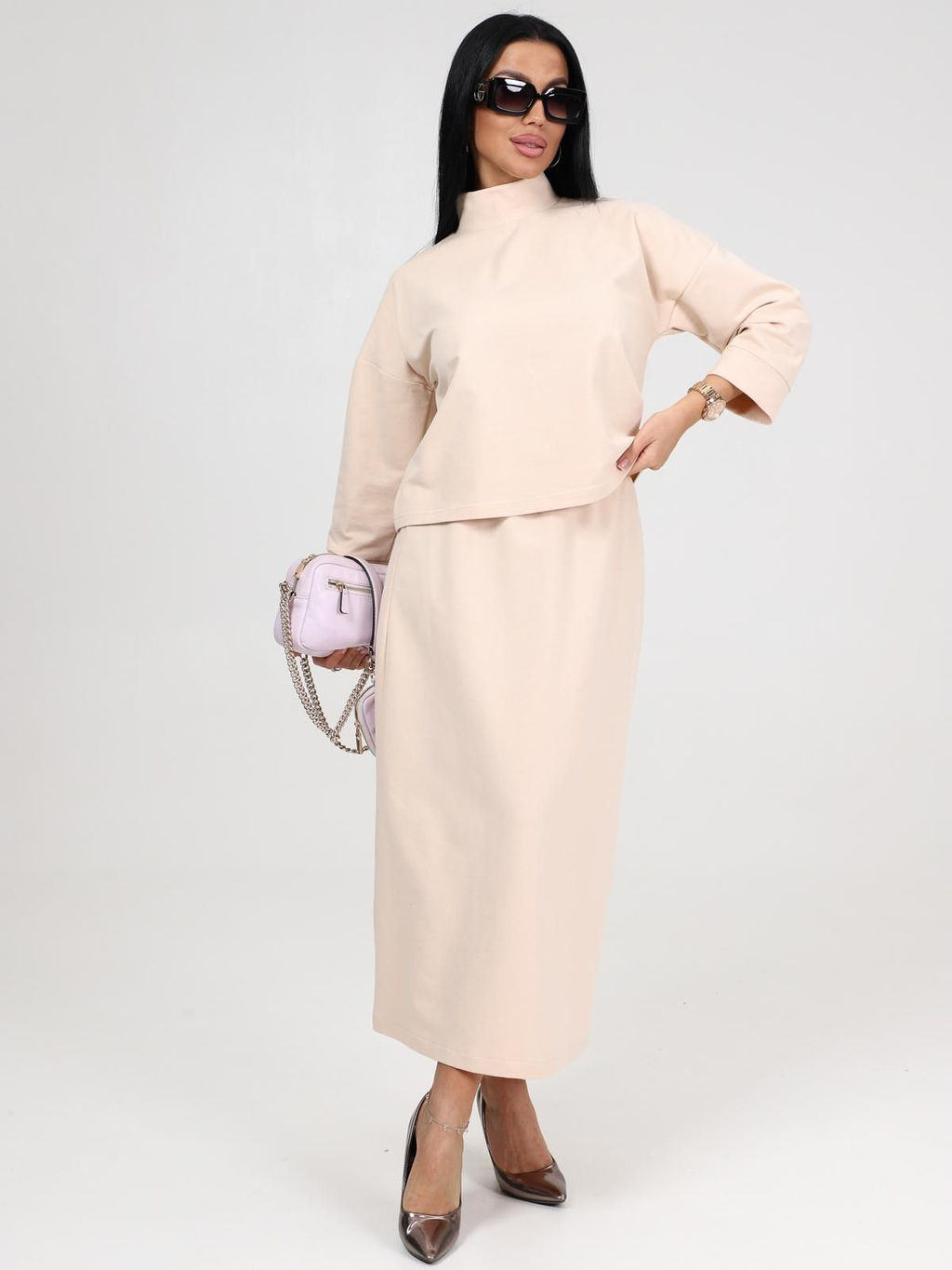 Костюм женский из футера двунитки с лайкрой. Кофта свободного силуэта, укороченная, со спущенным плечом. Рукав 3/4 с манжетой. Воротник - стойка. Юбка длина макси, расклешенная к низу. Пояс на резинке.­