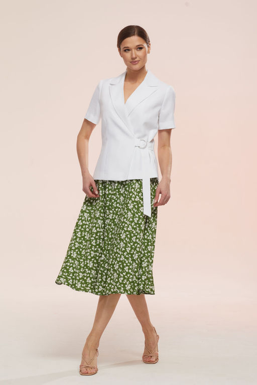 Состав: Жакет: Вискоза-32%; ПЭ-65%; Спандекс-3%; Юбка: ПЭ-26%; Хлопок-72%; Эластан-2%; Стильный комплект, состоящий из жакета с коротким рукавом и юбки-клеш. Короткий жакет прилегающего силуэта с глубоким вырезом, отложным воротником формы ласточкино крыло, застежкой на декоративную пряжку с поясом. Пояс акцентирует внимание на талию. По полочке и спинке для прилегания созданы рельефные бочки, по полочке дополнительно рельефная вытачка. Длина жакета по среднему шву спинки-61 см. Рукав втачной, одношовный, длиной 22.5 см. Полочка и спинка жакета на подкладке. Юбка комплекта в форме клеш. По талии полочки и спинке расположены вытачки. В среднем шве юбки потайная молния. Пояс притачной, шириной 4 см. По бокам пояса вставлена детально резинка ш.3.5 см, придавая дополнительную растяжимость для обхвата. талии. Пояс имеет застежку петля/пуговица (фурнитура может отличаться от представленной на рекламном фотоматериале) Особые рекомендации: рекомендуется холодная деликатная ручная стирка, без использования отбеливающих СМС, без интенсивного трения. Сушка в вертикальном положении. ВТО с минимальным паром. -- Характеристики -- Состав: Жакет- Вискоза-32%; ПЭ-65%; Спандекс-3%; Юбка- ПЭ-26%; Хлопок-72%; Эластан-2%; Сезон: Весна Рост: 164 Страна бренда: Беларусь