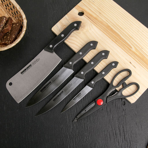 Набор кухонных принадлежностей, 5 предметов, 4 ножа 10,5 см, 16,5 см, 16,5 см, 17 см, ножницы 21,5 см, цвет чёрный