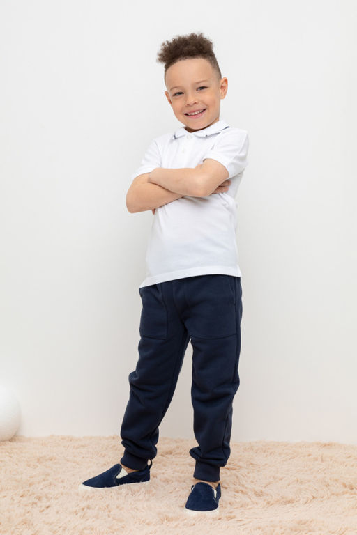 Трикотажные брюки для мальчика из футера с начесом. В составе 80% натурального хлопка и 20% полиэстера, при этом полиэстер ввязан внутрь по особой технологии и не соприкасается с кожей. Эластичный пояс на резинке регулируется по ширине с помощью шнурка, по бокам два удобных накладных кармана, внизу эластичные манжеты.­