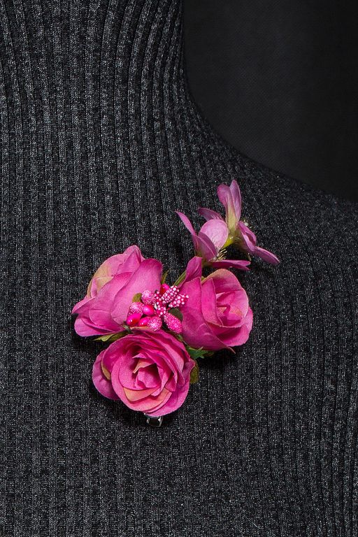 Цветочные композиции прочно поселились в летнем женственном гардеробе. Привлекающий внимание аксессуар - букетик роз яркого розового цвета.