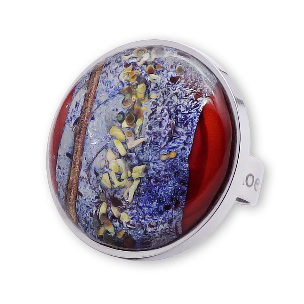 Кольцо изготовлено из муранского стекла и гипоаллергенной ювелирной стали, что очень важно для людей с чувствительной кожей. Металл не темнеет и не подвергается воздействиям окружающей среды, надолго обеспечивая красивый внешний вид изделия. Диаметр стеклянного элемента - 2,5 см. Кольцо безразмерное, регулируется с 16 до 19 размера. Вес - 12 гр.