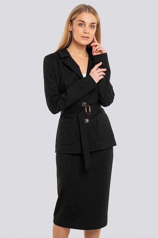 Этой весной актуальны костюмы с приталенным жакетом и юбкой до колена. Такой костюм поможет выглядеть женственной и привлекательной. Жакет приталенного силуэта с английским воротником и застежкой на пуговицы. На переде накладные карманы. Талию подчеркивает пояс на пряжке. Дополняет жакет юбка-карандаш элегантной длины. Пояс юбки на резинке. 75% хлопок, 20% полиэстер, 5% спандекс.