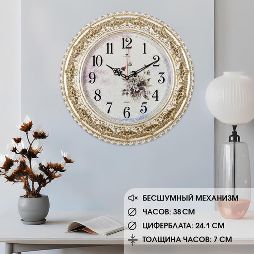 • Часы настенные классические Полевые цветы, бесшумные, плавный ход, d=38 см, золотистые, от батарейки 1?АА