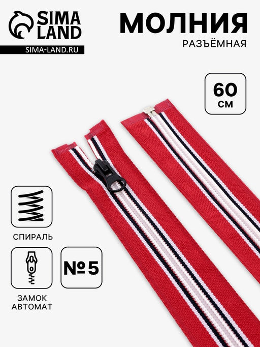 • Цена за 10 шт. Молния «Спираль», №5, разъёмная, замок автомат, 60 см, красная, белая, чёрная