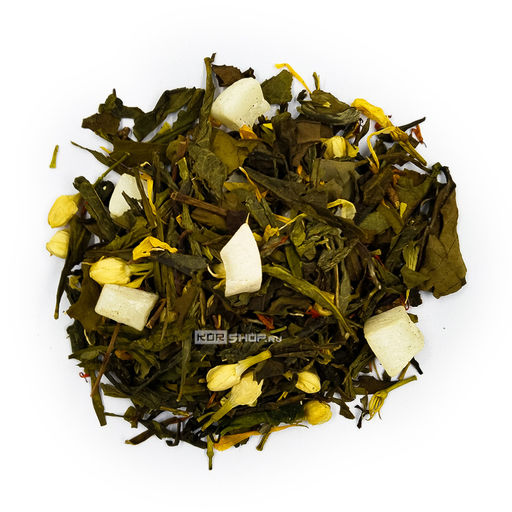 Состав: сенча, лун цзин, бай му дань, кусочки кокоса, лепестки османтуса, василька, жасмина и календулы, ароматические масла.