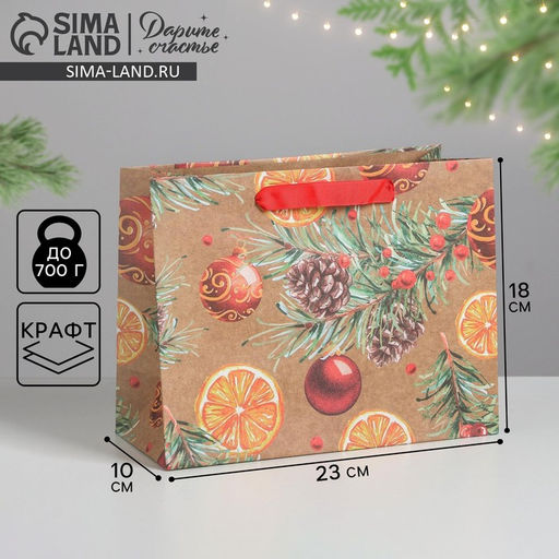 Набор: Нет. Для кого: Унисекс. Форма: Прямоугольная. Плотность, г/м: 150. Рекомендуемая нагрузка, кг: 1. Допустимый вес вложения, г: 1000. Тематика: Новогодняя. Тематика: Фрукты. Тематика: Растительный орнамент. Рисунок: Да. Символ года: Нет. Тематика праздника: Новый год. Отделка пакета: Крафт. Расширение: Без складки. Вид ручки: Ручка-лента. Форма пакета: Горизонтальный. Особенности: Без особенностей. Бесплатная доставка: Да. Наша разработка: Да. Размеры товара: 11.5/27/23.