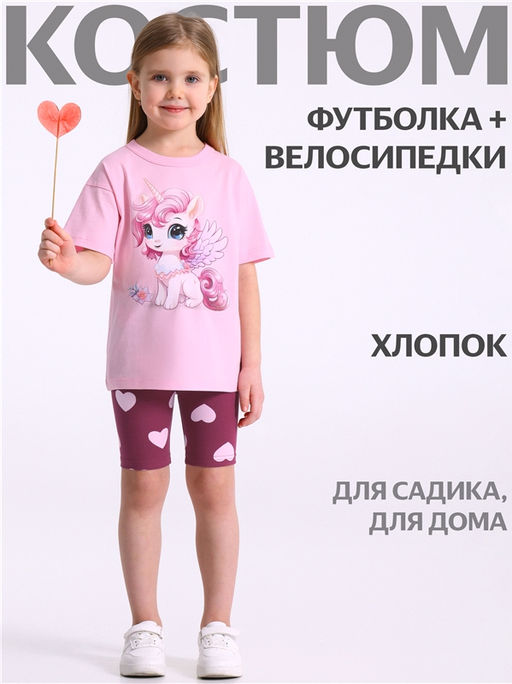Уценка футболка+велосипедки,хлопок 100%, хлопок 92% + лайкра 8%, / хлопок 100%, хлопок 92% + лайкра 8%,- / светло-розовый14+светло-розовые сердца на бордовом / Кудрявый единорог / - / - / -