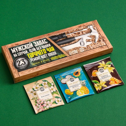 Чай чёрный «Ваниль и карамель», ароматизированныйСостав: чай чёрный байховый, ароматизаторы пищевые.Чай чёрный «Тропические фрукты».Состав: чай чёрный байховый, ароматизаторы пищевые.Чай зелёный «Жасмин», ароматизированный.Состав: чай зелёный байховый, ароматизатор: жасмин.Масса нетто: 21,6 г (12 пакетика x 1,8 г)Срок годности: 36 месяцев. Набор: Нет. Вес нетто, г: 21.6. Фасовка: Пакетированный. Вид чая: Ассорти. Тематика праздника: 23 Февраля. Подарочный чай: Да. Добавки чая: Без добавок. Вид: В индивидуальных конвертах. Бесплатная доставка: Да. Наша разработка: Да. Примечание: Дата изготовления зависит от партии поставки.. Примечание: При оформлении заказа, просим запрашивать актуальные сроки годности у менеджера..