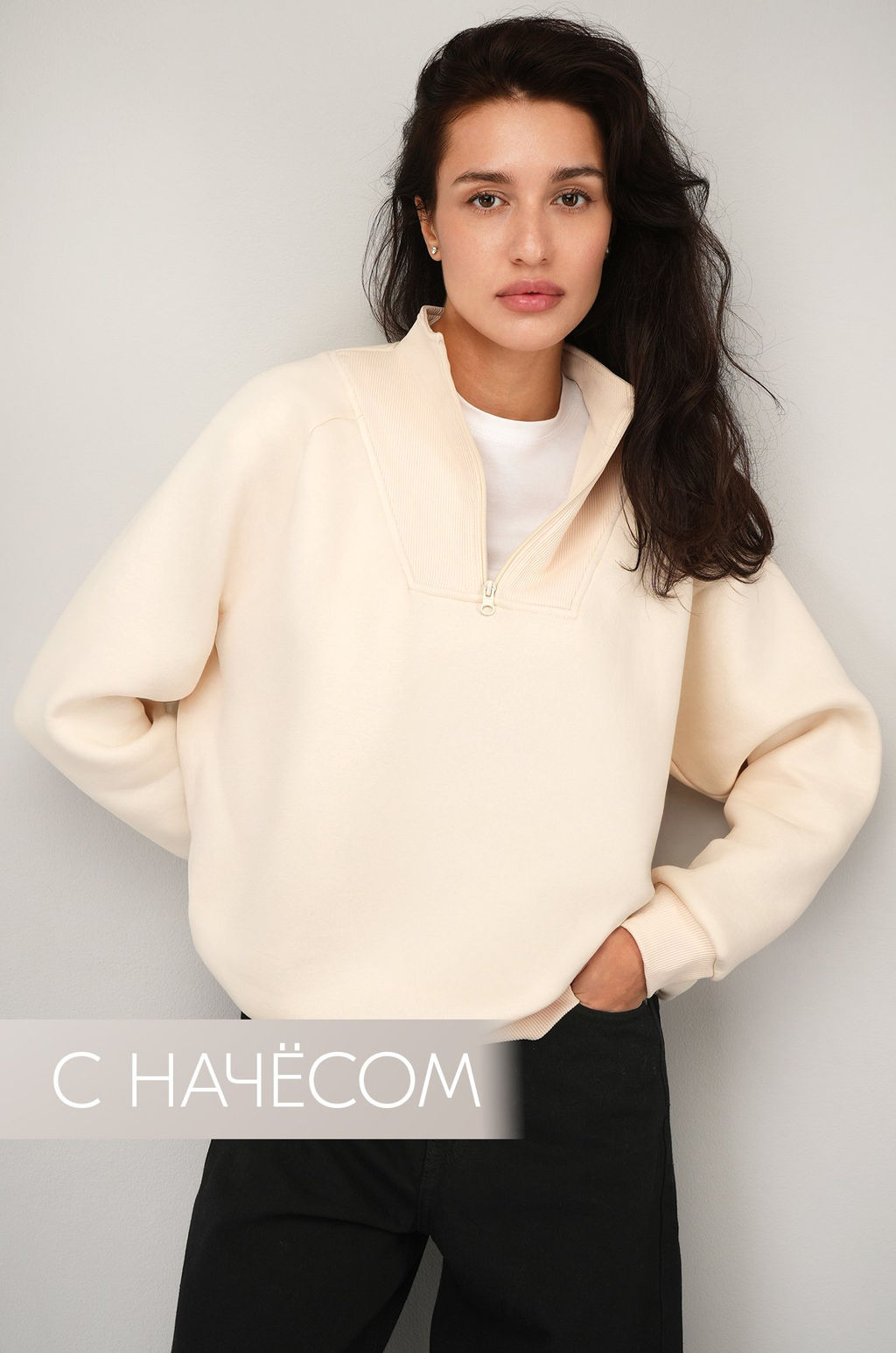 молочный свитшот с полузамком на молнии защищает от ветра и добавляет стильный акцент;