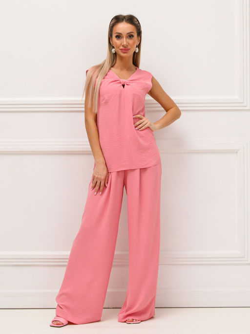 Стильный костюм полуприлегающего силуэта из текстильной ткани розового цвета. V-образный вырез изделия обработан внутренней обтачкой и дополнен декоративным перекрутом. Проймы рукавов обработаны окантовкой. Брюки прямого силуэта, верхняя часть брюк обработана поясом с резинкой. Перед брюк дополнен складками, по бокам - внутренние карманы. Длина блузки по спинке от плечевого шва до низа изделия см. Длина брюк от пояса до низа изделия см. Рост фотомодели - 170 см.