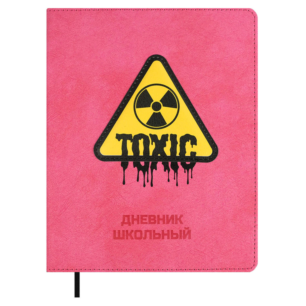 Дневник школьный арт. 68743 / 15 ТОКСИК (кожзам: А5+; твёрдый переплёт, материал обложки: искусственная кожа "Ренцо"; декор: аппликация из искусственной кожи, блинтовое тиснение, печать шелкографией в одну краску; способ крепления блока: ниткошвейный; вн. блок: 48 л., белый офсет 80 г/м?, печать в одну краску, справочный материал: универсальная шпаргалка; отделка среза: окрашивание пантоном; закладка: одно ляссе; форзац: печать в одну краску; индивидуальная упаковка: ПЭТ-пакет)