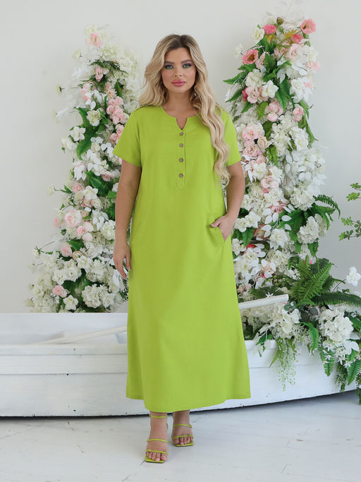 Обаятельное платье прямого силуэта из текстильной ткани зеленого цвета. Фигурный вырез изделия обработан внешней обтачкой. Верхняя часть переда дополнена планкой с застежкой на пуговицы. По бокам изделия - внутренние карманы. Длина изделия по спинке от плечевого шва до низа изделия 131 см. Рост фотомодели - 170 см.