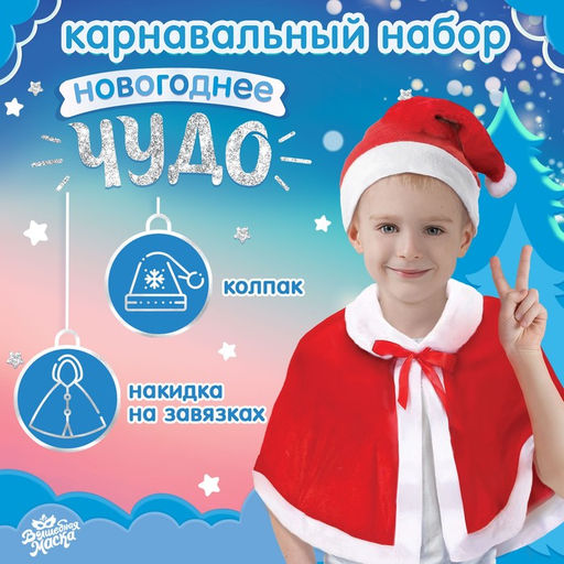 Карнавальный набор Новогоднее чудо это яркие аксессуары для создания праздничного образа. Они поднимут настроение и добавят новогоднего волшебства. Этот набор прекрасно подойдет для взрослых и детей, делая праздничный образ незабываемым и выделяющимся.ОсобенностиНакидка выполнена из мягкого и легкого материала, удобно сидит и не стесняет движений.Колпак традиционной формы, украшен помпоном. Он дополняет образ, придавая ему игривости и лёгкости.Этот карнавальный набор идеально подойдет для новогодних праздников, утренников, корпоративов и тематических вечеринок. Он может стать отличным дополнением к новогоднему костюму или использоваться в качестве самостоятельного аксессуара. Накидка и колпак создадут атмосферу праздника и подарят яркие эмоции всем участникам торжества. Тематика праздника: Новый год. Возраст: Детский. Составляющие набора: Головные уборы. Составляющие набора: Предметы одежды. Тематика: Новогодние. Бесплатная доставка: Да. Наша разработка: Да.