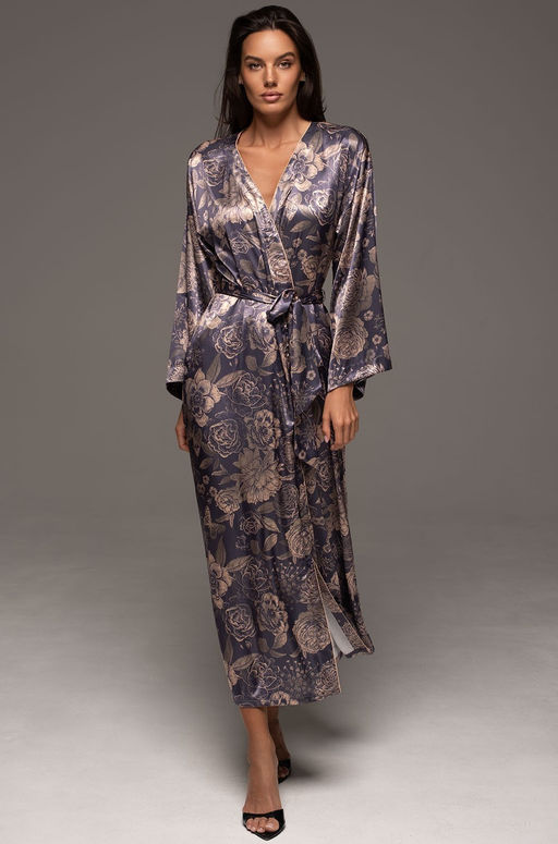Длинный запашной халат Mia-Amore выполнен из принтованного смесового полотна. Низ рукавов, планка бортов отделаны контрастным кантом. Халат запахивается на пояс, в боковых швах есть карманы.70% натуральный шелк, 25% полиэстер, 5% эластан