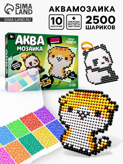 С аквамозаикой от торговой марки «Эврики» ребёнок соберёт объёмные фигурки из шариков-пикселей. Детали плотно скрепляются друг с другом. С поделками можно играть или носить с собой как брелоки.В пластиковом контейнере с отсеками удобно хранить бусинки.Как сделать фигуркуВыберите рисунок и поместите его под прозрачную основу.С помощью пинцета выложите цветные шарики по образцу.Наберите в бутылочку воды.Распылите воду на фигурку так, чтобы бусинки были равномерно покрыты водой.Оставьте мозаику на 30–40 минут до полного высыхания.После высыхания аккуратно снимите поделку с основы.Можете использовать получившуюся фигурку для создания оригинальных брелоков и украшений.В пластиковом контейнере с отсеками удобно хранить бусинки.Польза занятий с аквамозаикойИгра с мозаикой развивает мелкую моторику, цветовое восприятие и усидчивость, позволяет ребёнку проявить креативность в удивительном процессе изготовления фигурки.Подходит для детей от 4 лет. Для кого: Унисекс. Возраст: От 3 лет. Количество элементов: 2500. Тематика: Животный мир. Тематика: Детская. Бесплатная доставка: Да. Наша разработка: Да. Размеры товара: 6/18/24.