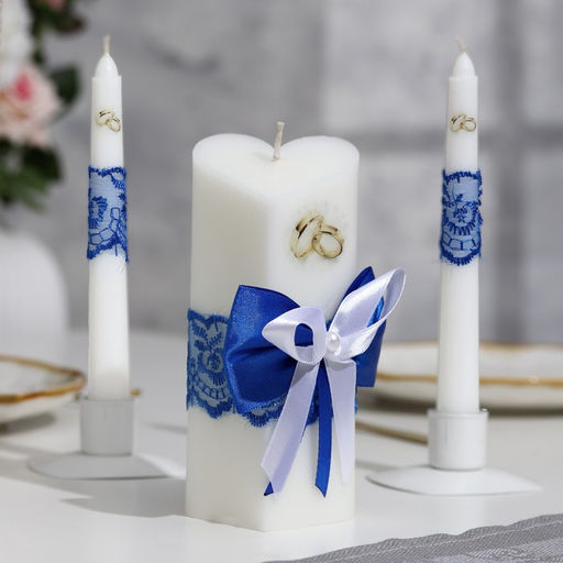 Набор свечей «Кружевной с бантиком», синий: домашний очаг 6.8×15 см, родительские 1.8×17.5 см