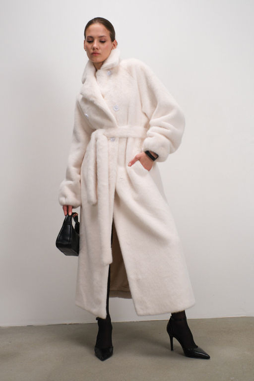 Элегантное двубортное пальто из эко-меха "под норку". Оно легко застегивается на пуговицы и клипсу. Классический английский воротник и удобные карманы добавляют практичности. Сзади по среднему шву - разрез. Рукав реглан обеспечивает идеальную посадку, низ рукава - на резинке. В комплекте - пояс.
