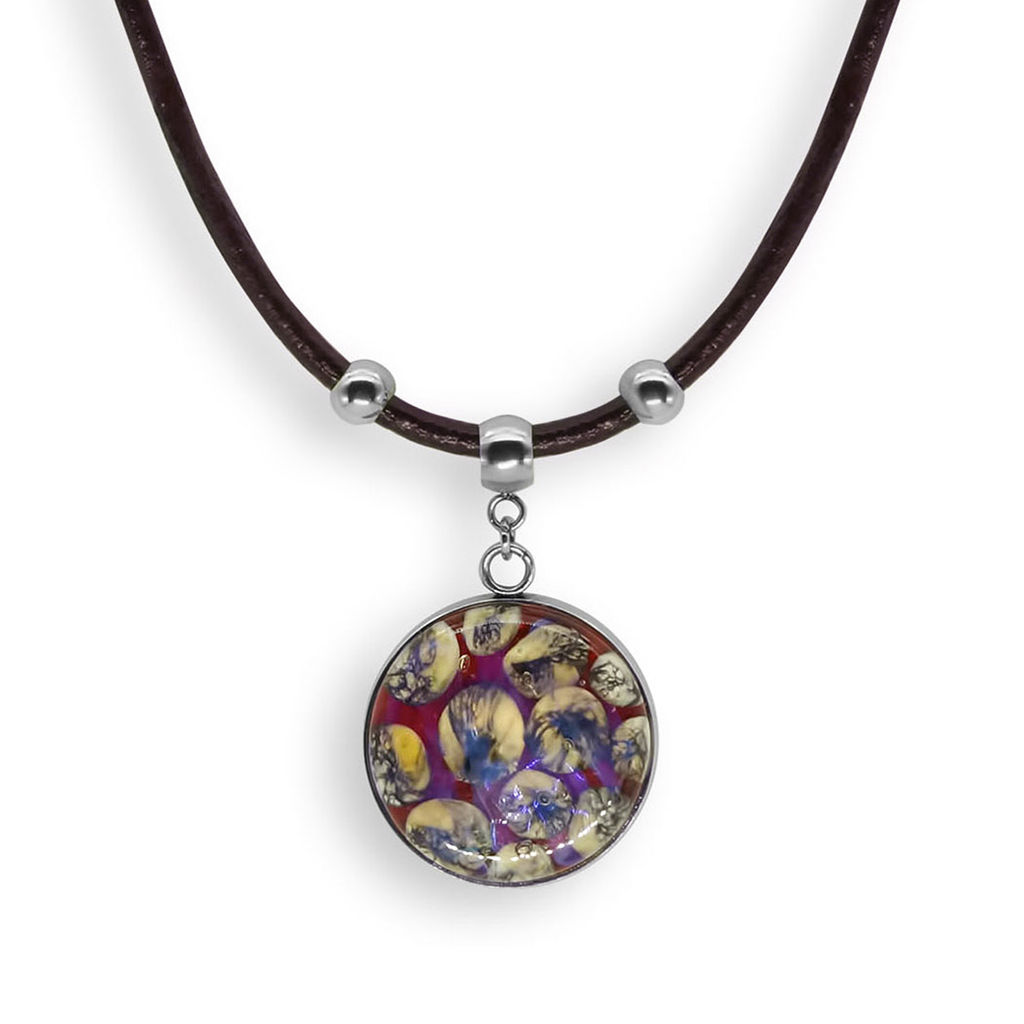 Колье изготовлено из натуральной кожи, муранского стекла и гипоаллергенной ювелирной стали, что очень важно для людей с чувствительной кожей. Металл не темнеет и не подвергается воздействиям окружающей среды, надолго обеспечивая красивый внешний вид изделия. Длина колье - 46 см + 5 см. удлиняющая цепочка. Диаметр стеклянного элемента - 2,5 см. Вес - 15 гр.­