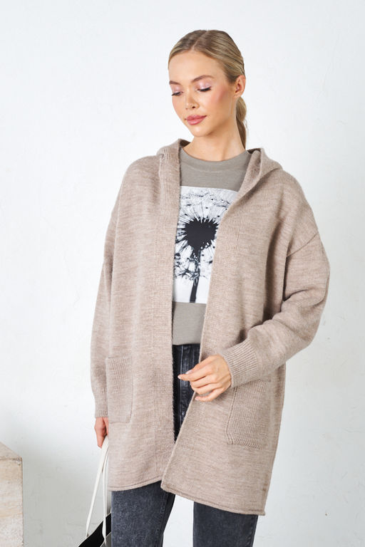 Кардиган свободного силуэта с капюшоном, со спущенной линией плеча и длинным рукавом. На передней части изделия выполнены карманы. Низ изделия и низ рукава оформлены резинкой. Изделие выполнено из мягкой меланжевой пряжи.
