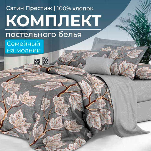 Семейное постельное белье из сатина «Престиж» плотностью ткани 115 г/м2 - идеальное решение для создания уюта и комфортного сна. В комплекте: 2 пододеяльника 150 * 215 см, оснащенных удобной потайной застежкой на молнии, простыня 240 * 220 см, наволочки 70 * 70 см на молнии - 2 штуки, 50 * 70 см на молнии - 2 шт. Постельное белье из сатина «Престиж» нежное, мягкое, похожее на шёлк, но при этом прочное, износостойкое, выдерживает многочисленные стирки, не теряя исходного цвета. Семейный комплект постельного белья из сатина «Престиж» с роскошным дизайном и великолепным качеством ткани и пошива прослужит долго и будет радовать Вас и ваших близких. -- Характеристики -- Вес: 2900 кг Размерность комплекта: Семейный Комплектность: 2 пододеяльника, 1 простыня, 4 наволочки Количество предметов в комплекте: 7 Размерность пододеяльника: 1,5 спальный Размер пододеяльника: 150x215 Кол-во пододеяльников в комплекте: 2 Замок пододеяльника: На молнии Размерность простыни: Евро Размер простыни: 240x220 Размер наволочки: 70x70 Замок наволочки: На молнии Кол-во наволочек в комплекте: 4 Ткань: Сатин "Престиж" Состав: 100 % хлопок Плотность: 115 г/м2 Плотность плетения: Высокая Режим стирки: При 40 градусах Цвет: Серый Расцветка: Шепот ночи Вид принта: Листья Целевая аудитория: Взрослая