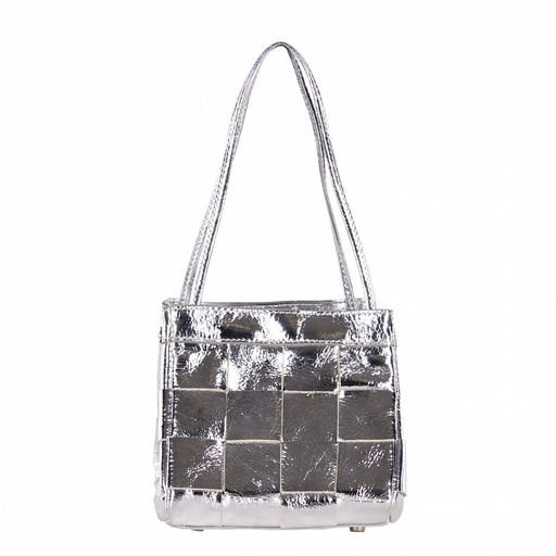 Эффектная металлизированная сумка-плетенка, выполнена из кожи. Дополнена серебристой фурнитурой. Данная модель закрывается на кнопку. Каркас мягкий. Носится в руке за ручку или на плече за ремень. Дополнительно в комплекте имеется петелька.