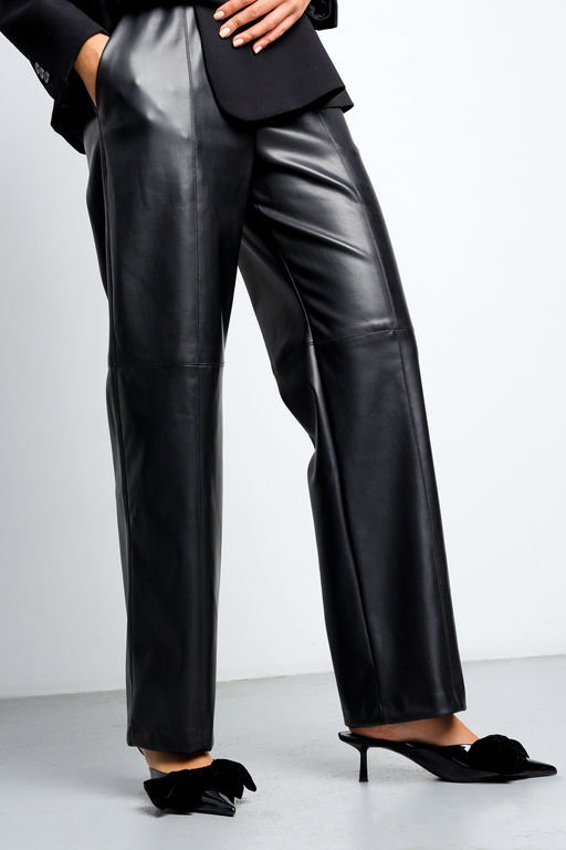 Кожаные модные штаны на резинке утягивают силуэт, подчеркивая все достоинства фигуры и скрывая недостатки. Они создают идеально пропорциональный и элегантный силуэт, который никого не оставит равнодушным. Крой этих солидных брюк даёт возможность насладиться свободой движений, не чувствуя дискомфорта.
