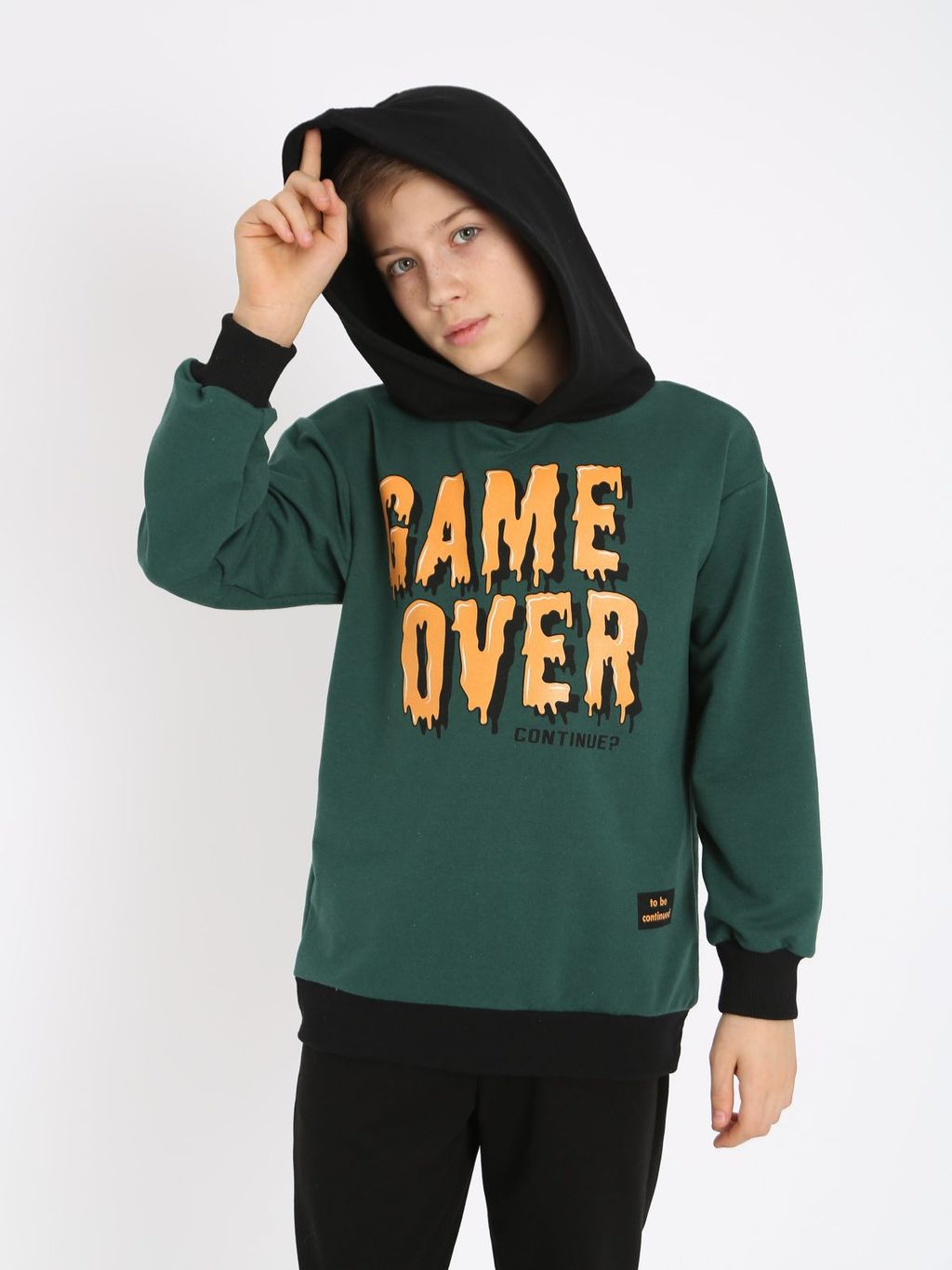 Толстовка из футера 2-х нитки свободного кроя. Толстовка с контрастным капюшоном, поясом и манжетами из эластичного трикотажа. Рукав втачной со спущенной линией плеча. На полочке - печать.­