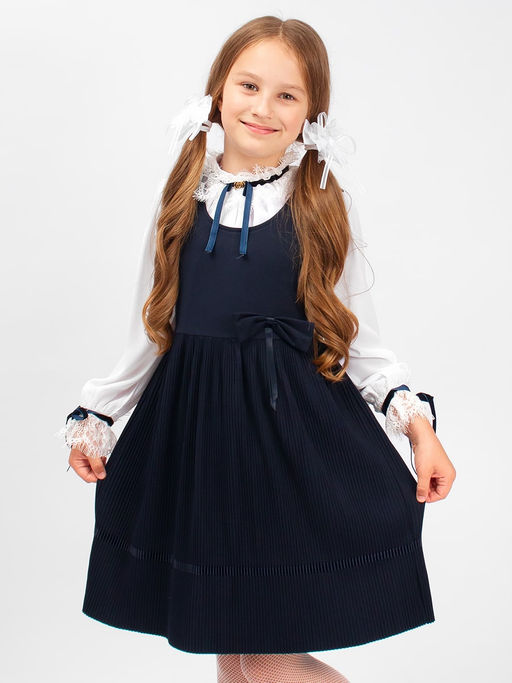 Очаровательный сарафан для девочки Соль&Перец из плотного трикотажа, с юбочкой-плиссе. Сарафан декорирован бантиком из основной ткани и атласной лентой. Износоустойчивый материал позволит надолго сохранить форму и привлекательный внешний вид изделия. Идеальный выбор для создания стильного, школьного образа.