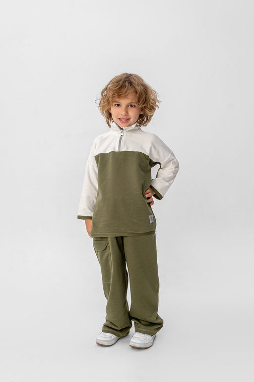 Костюм из футера двунитки. Свитшот и брюки. Свитшот дополнен нашитыми световозвращающими элементами. Брюки прямого кроя с боковыми карманами и накладным карманом на брючине.