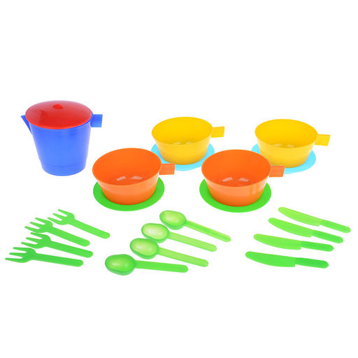 Набор детской посуды на 4 персоны позволит девочке почувствовать себя маленькой хозяйкой и устроить чаепитие для своих кукол. Набор развивает моторику рук, фантазию, мышление, коммуникативные навыки. Ребёнок учится использовать столовые приборы и другие кухонные атрибуты. Играть набором детской посуды можно дома, а также на свежем воздухе. Все элементы выполнены из качественного и безопасного пластика. Набор упакован в сеточку.