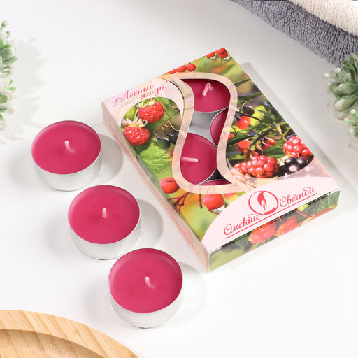 Набор: Да. Ширина, см: 3.8. Высота свечи, см: 1.6. Время горения, ч: 3.5. В наборе, шт.: 6. Вес, г: 12. Форма свечи: Гильза. Ароматизированные: Да. Аромат: Ягоды. Бесплатная доставка: Да.