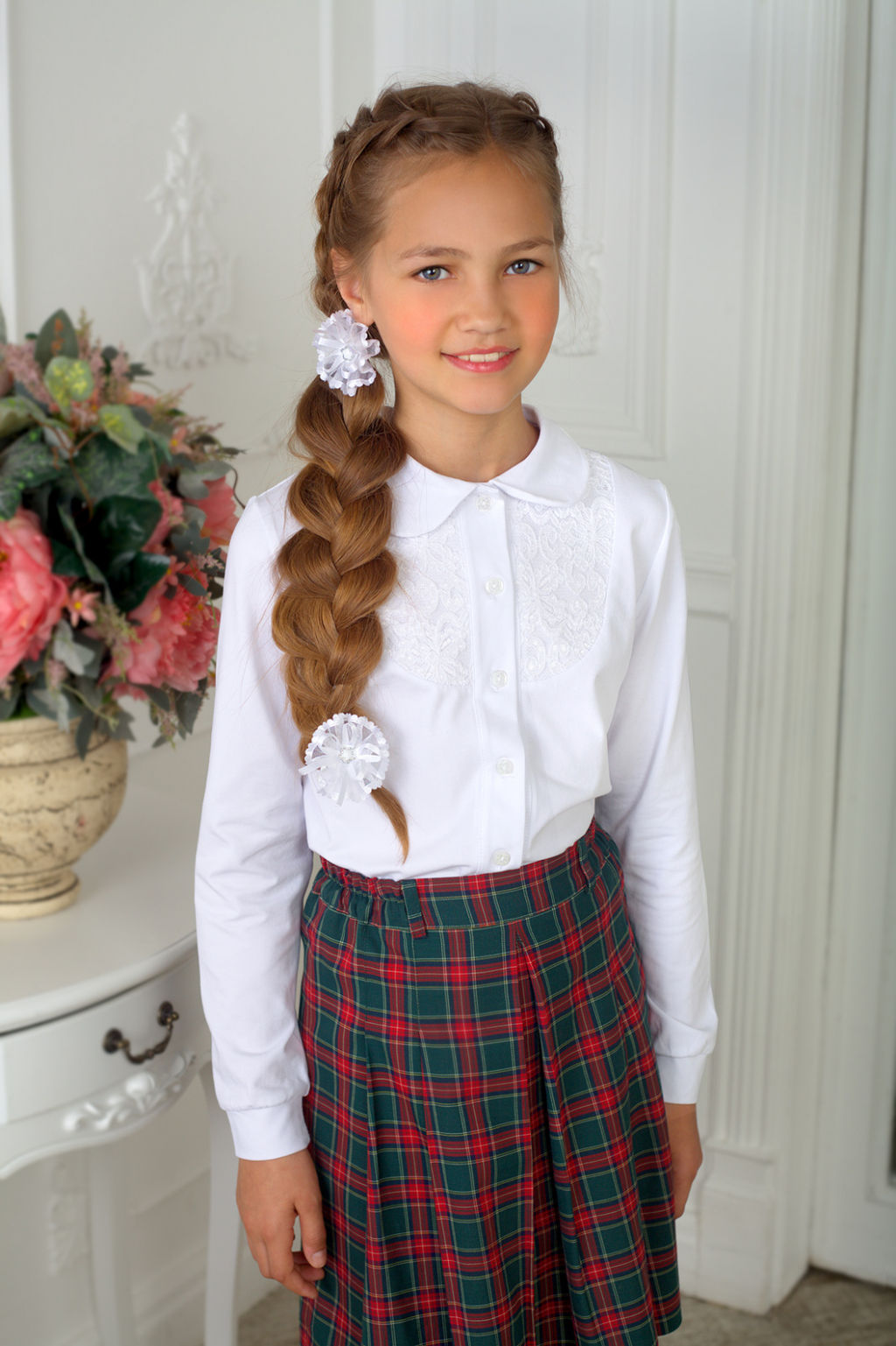 Изделие изготовлено из высококачественного трикотажного полотна,вставка из гипюра,с круглым воротничком,застежка на пуговицах.Рекомендована для школы.­