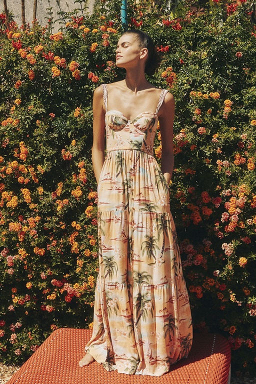 Макси-платье на бретельках украшено пуговицами спереди. Детали бюстгальтера спереди и принты ручной работы завершают образ.­