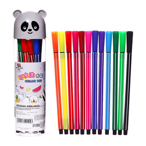 • Фломастеры 12 цветов Полоски в тубусе Панда серая, вентилируемый колпачок
